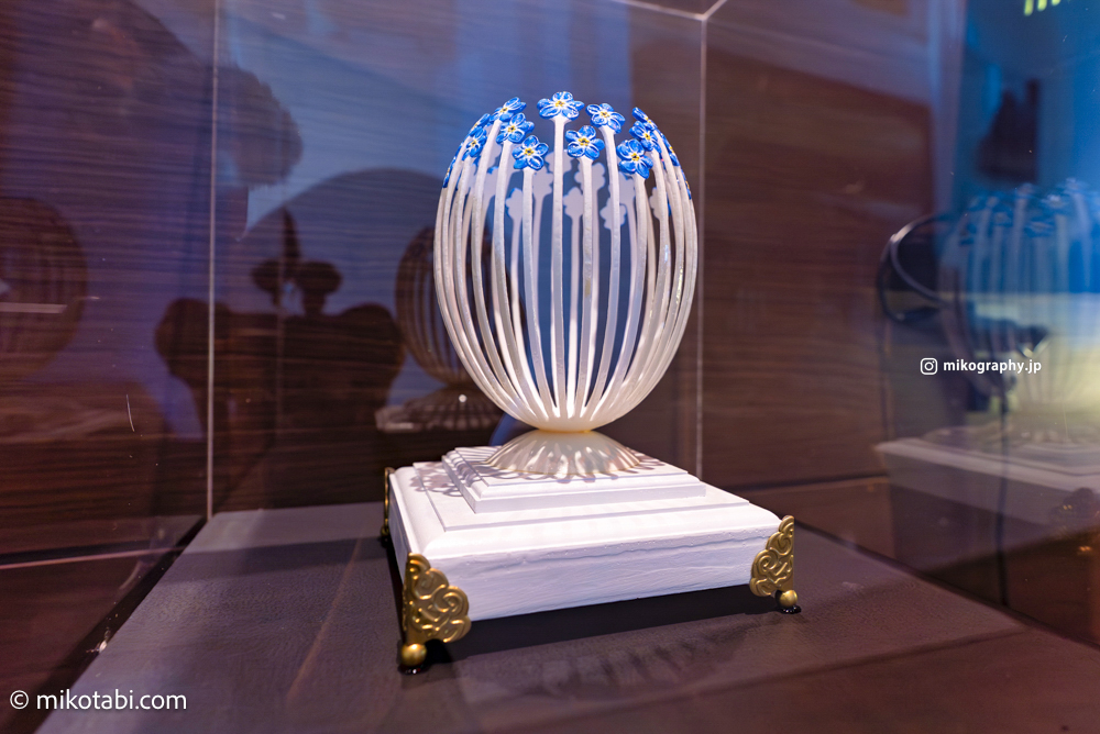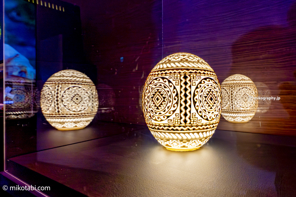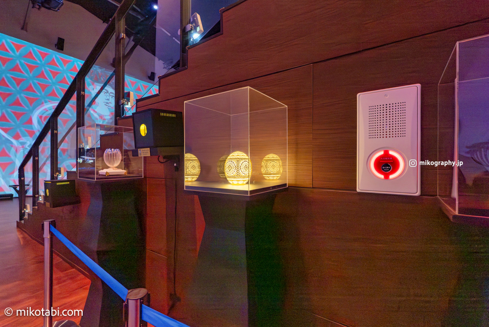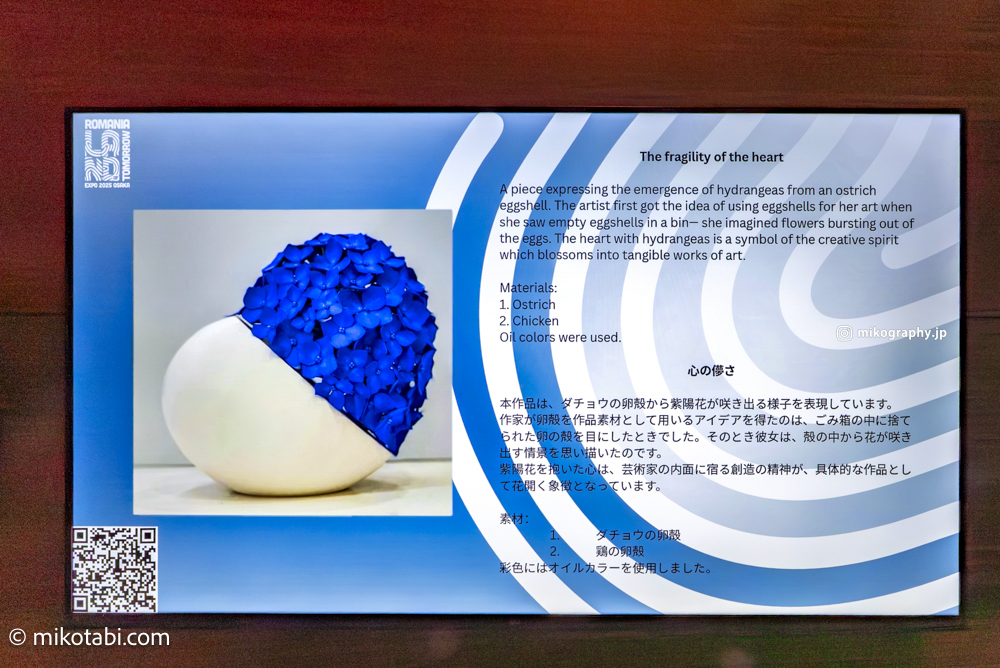 その近くには、ダチョウの卵殻から紫陽花が咲き出る映像が展示されており、「心の儚さ」をテーマに青の光で表現されています。