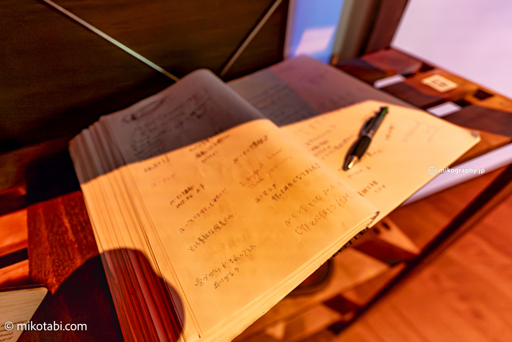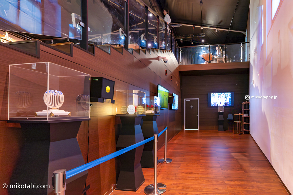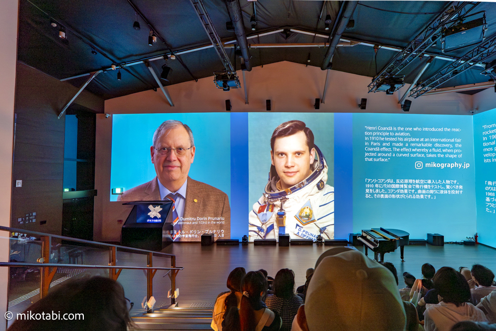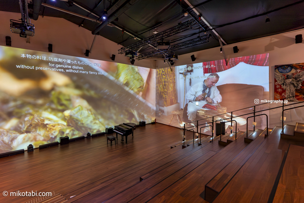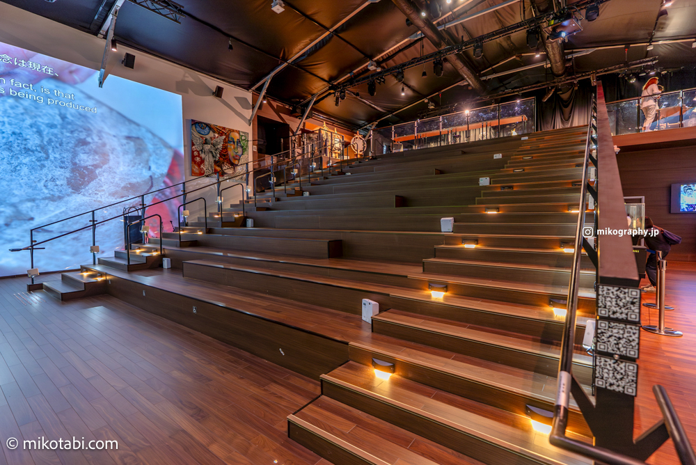 館内は、やや薄暗く幻想的な空間。2階分ほどの高さまで続く階段状の観覧席に着席して映像と音楽を聞きます。まるで小劇場のような雰囲気です。