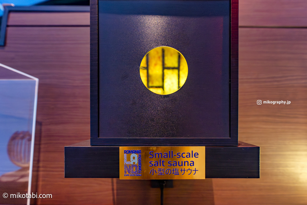 壁の覗き窓からは、塩で作られたミニチュアサウナの内部が見え、ルーマニアの“塩の癒し文化”を象徴。