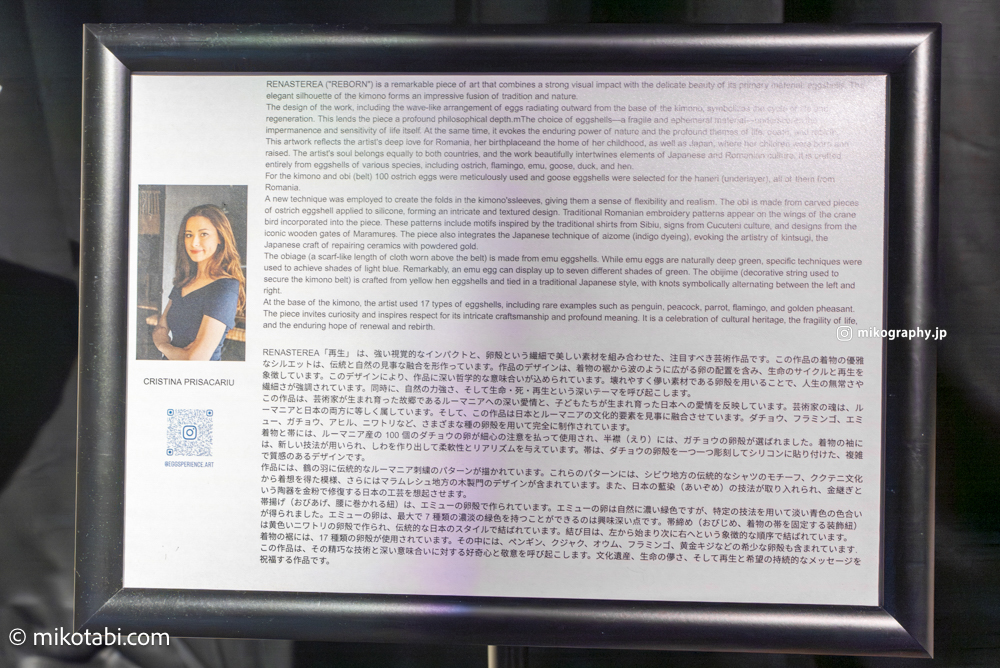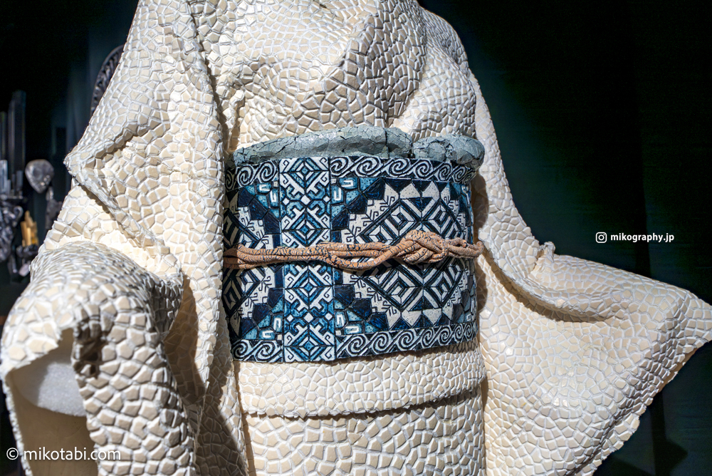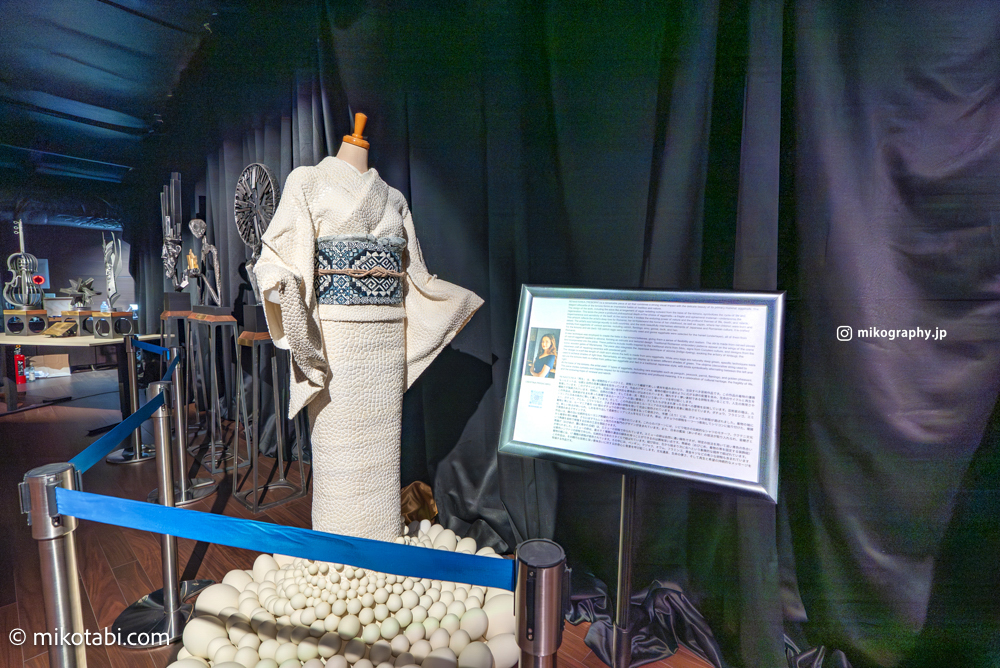 ルーマニア作家クリスティーナ・プリサカリウの作品「再生(Re nașterea)」、卵の殻を再生素材として用いた着物のような衣装です。