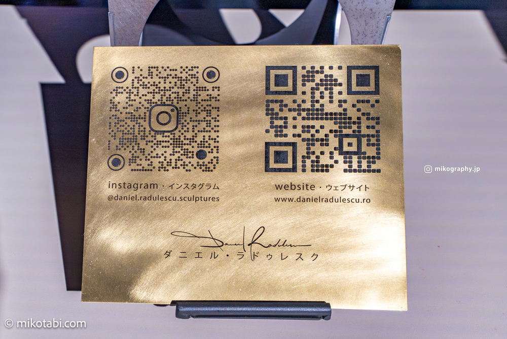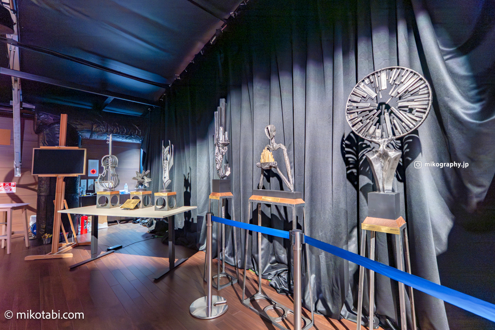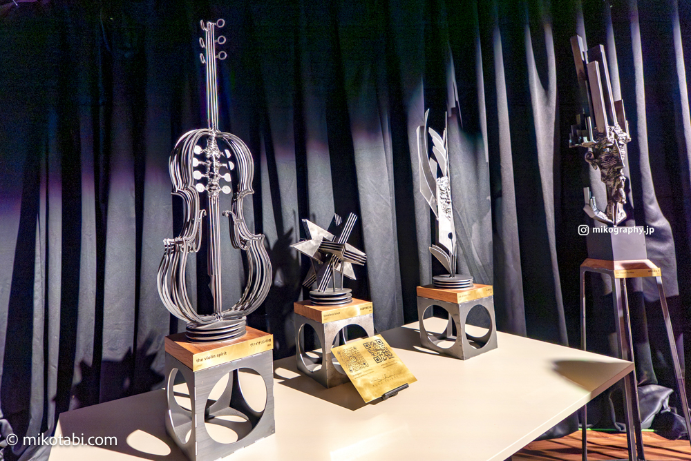 バイオリンをモチーフにしたオブジェ作品を3点展示。音と造形の融合を試みる金属彫刻家で、再生音楽を象徴するような造形が印象的。
