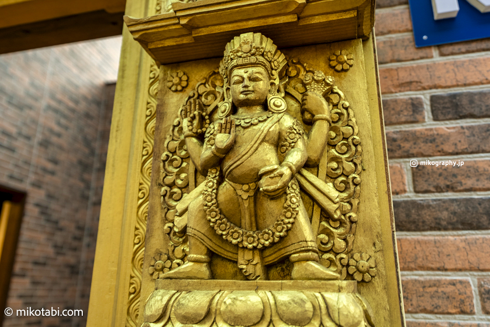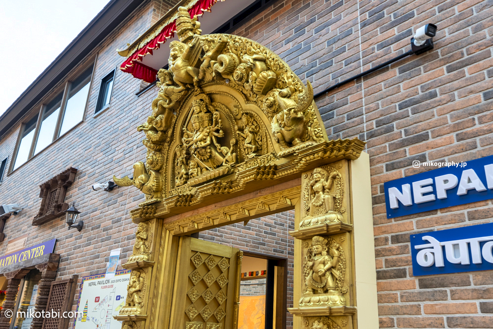 建築は伝統的な木彫り装飾や煉瓦づくりを再現、ネワール建築をモチーフにした赤レンガと木彫り装飾のファサードがとても印象的、入口に入った瞬間から「ここは万博じゃなくて、まるでカトマンズ?」と思ってしまうほど。