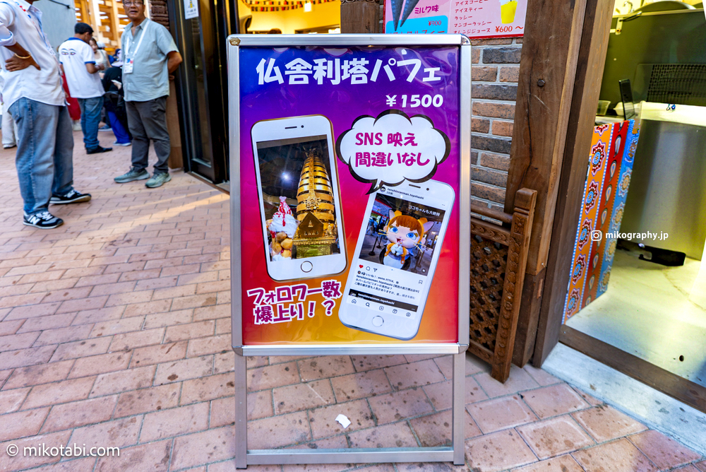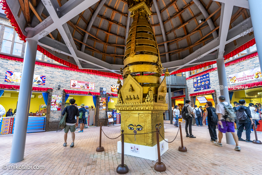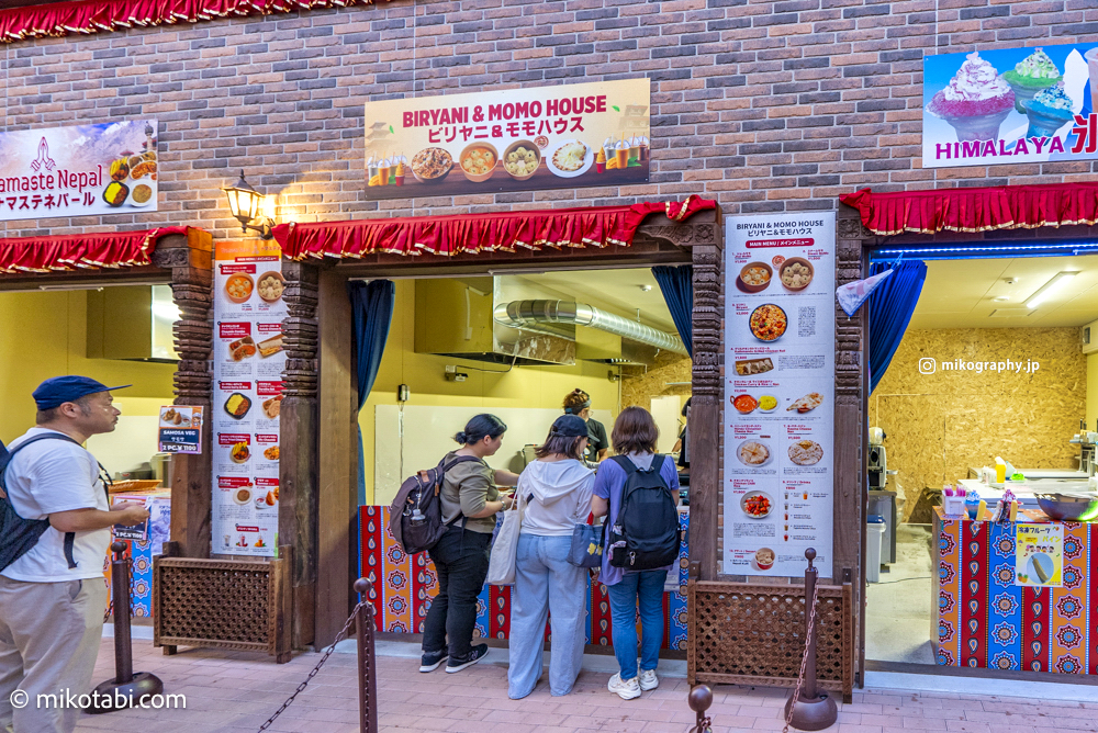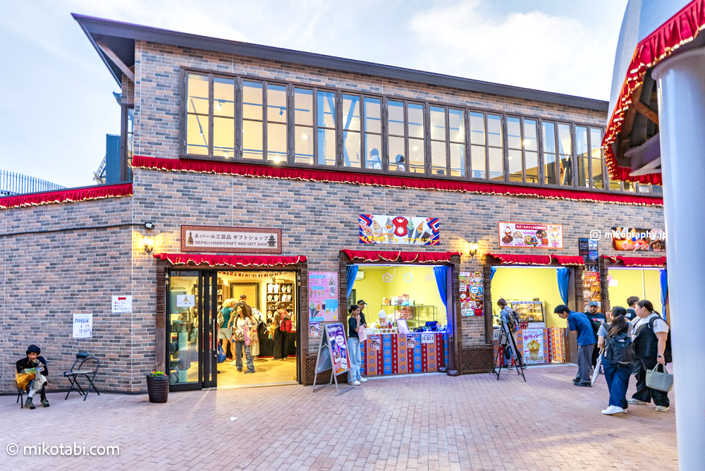 ネパールの街並みを模した通り沿いには、カラフルな旗や屋台風のショップが並び、耳をすませばネパール音楽がBGMとして流れています。