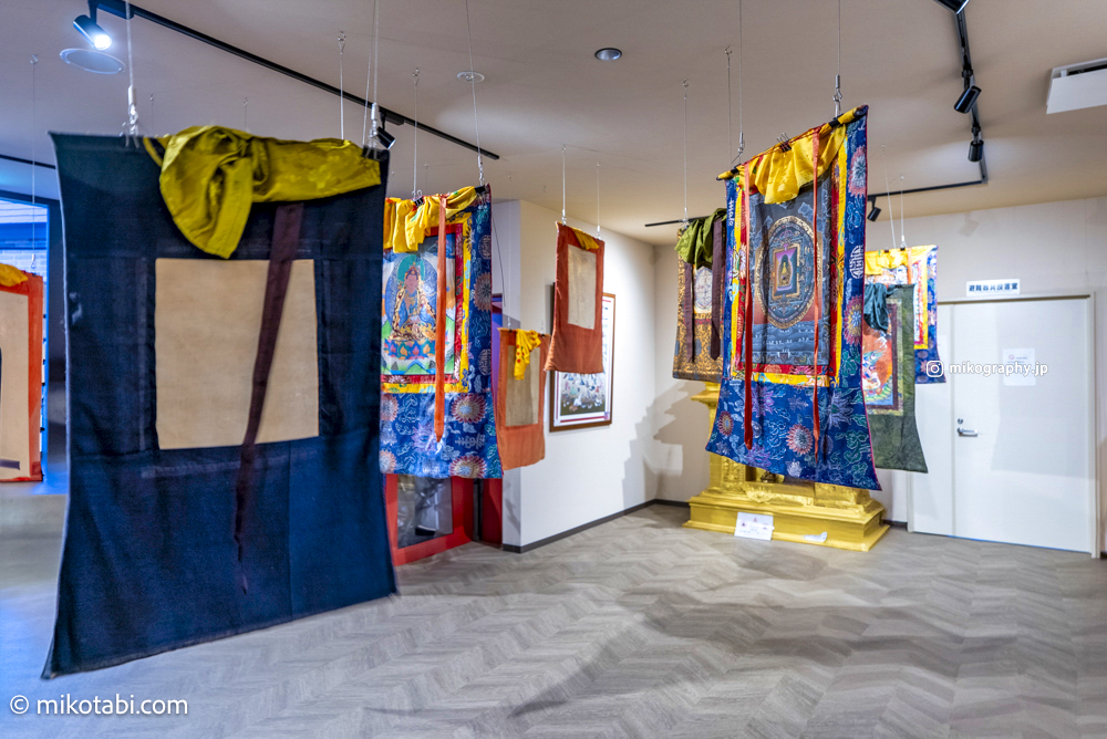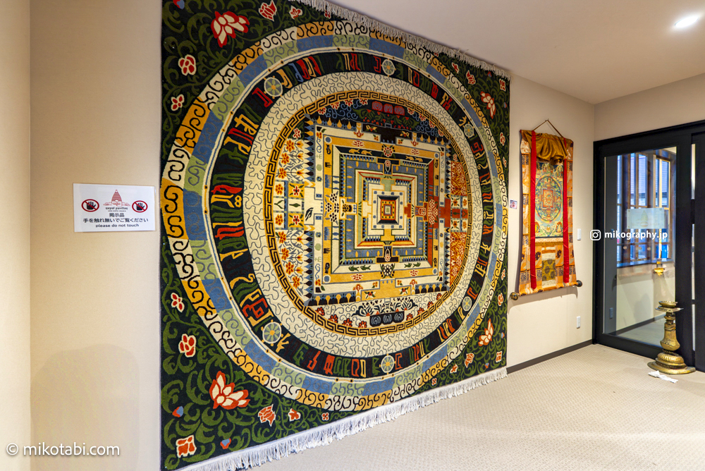 2階へ上がる階段の途中、壁一面に神様が描かれた絨毯のタペストリーが飾られていて圧巻。