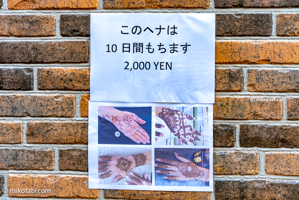 館内の一角には、ヘナタトゥーの体験コーナーもありました。