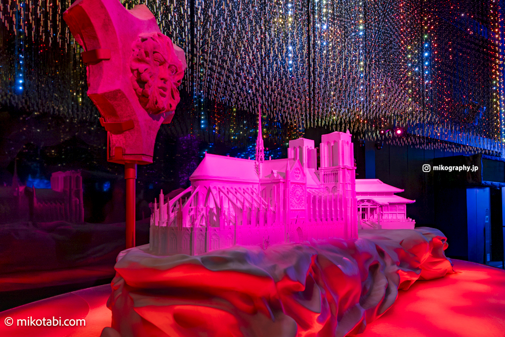 フランスと日本の“愛の絆”をテーマに、ノートルダム大聖堂と首里城、モン・サン=ミッシェルと厳島神社などがネオンに照らされます。