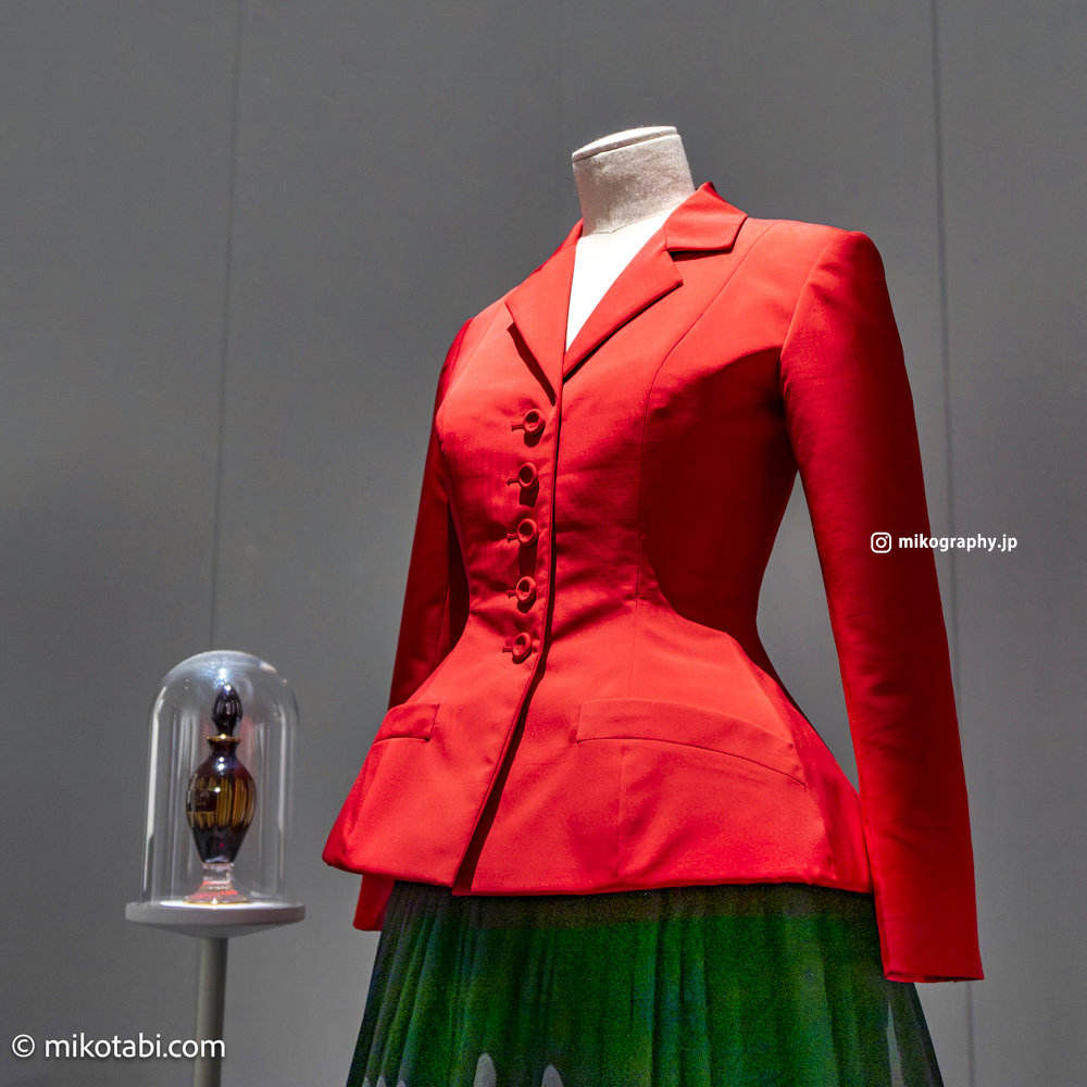 ウエストを強調し、腰から下はふんわり広がるシルエットが特徴の 1947年のバージャケット は、ディオールの伝説的コレクション「ニュー・ルック(New Look)」を象徴する一着。