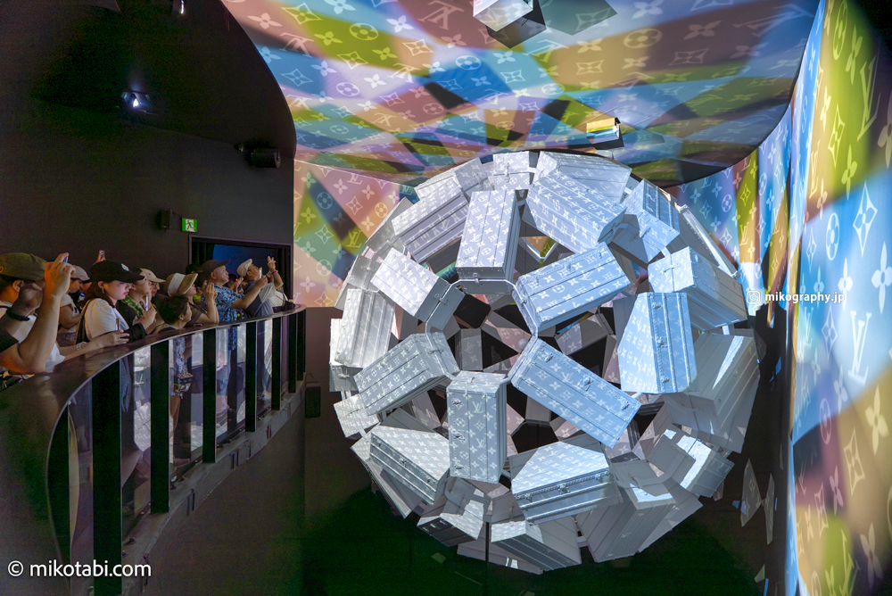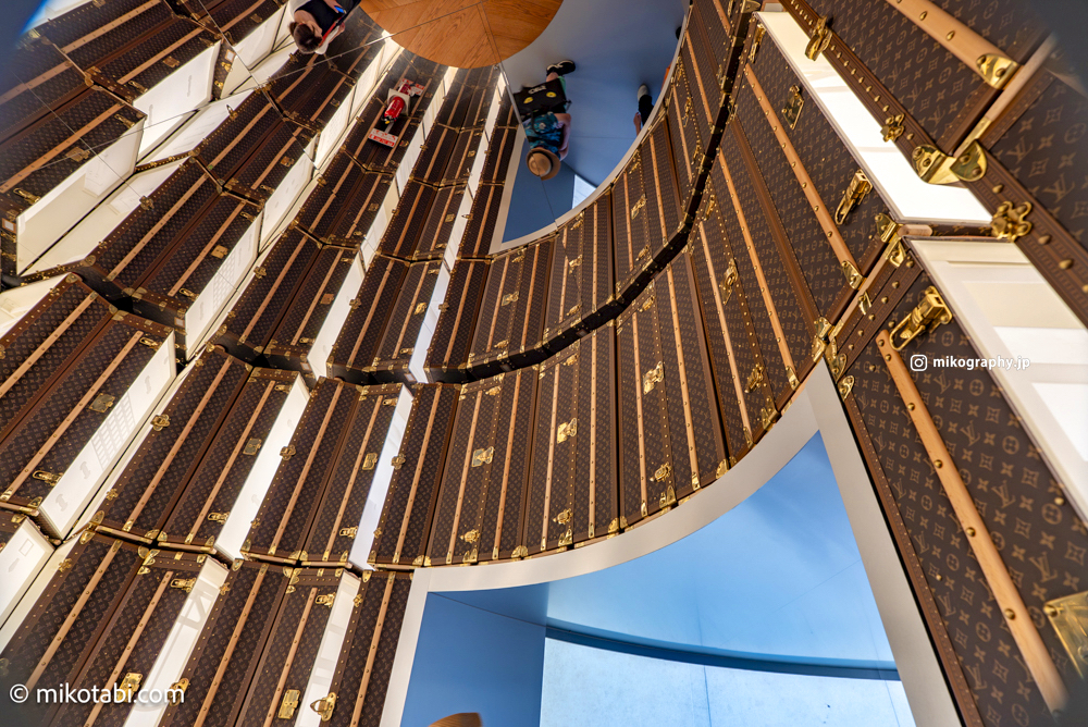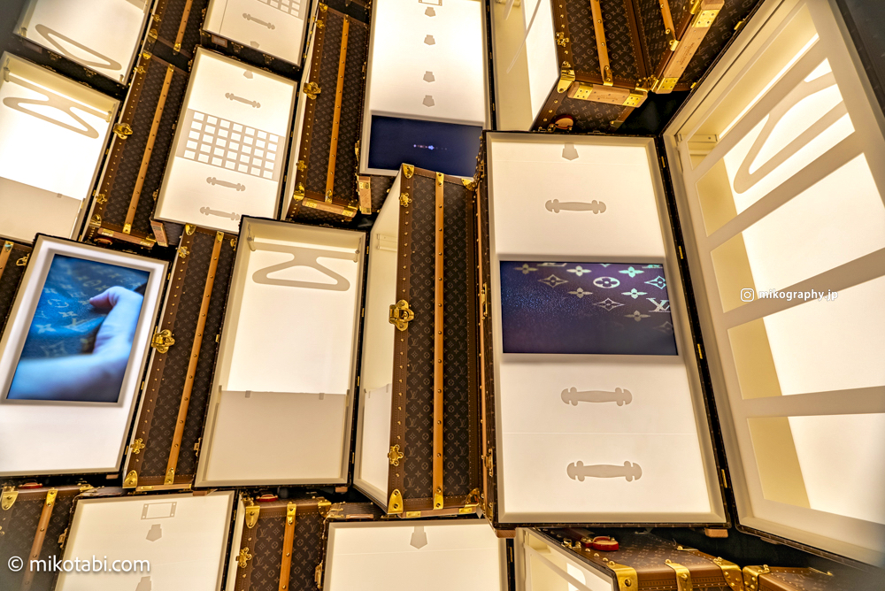 次のエリアでは、壁一面にルイ・ヴィトンのトランクが84個ずらりと並びます。
