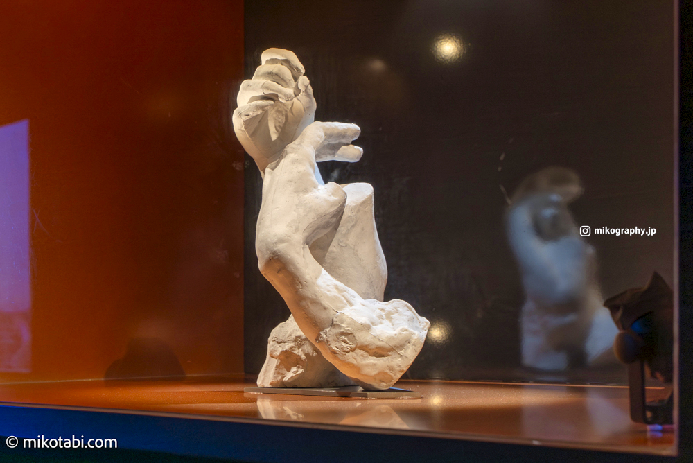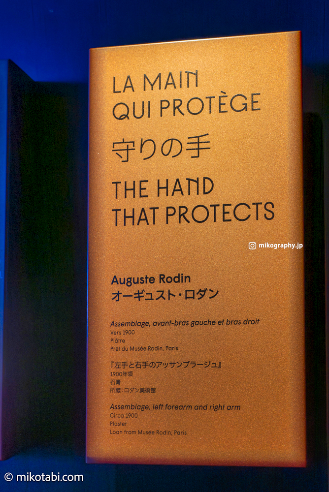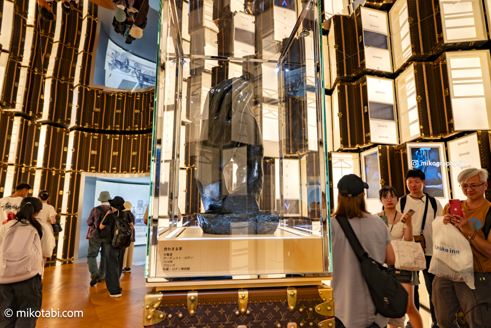 中央には実物のモノグラム・トランクの上に、ロダン作「守りの手」が展示されています。