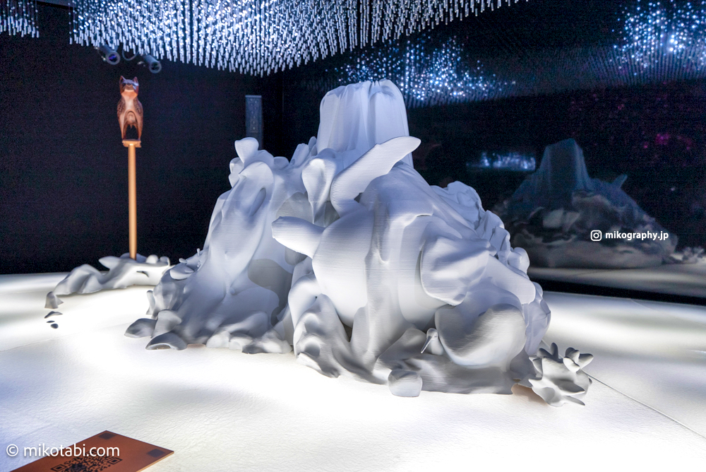 照明がやわらかく落とされた空間には、自然の力強さと静けさを表現した「もののけ姫」のタペストリーや、ノートルダム大聖堂のキメラ像が展示されています。