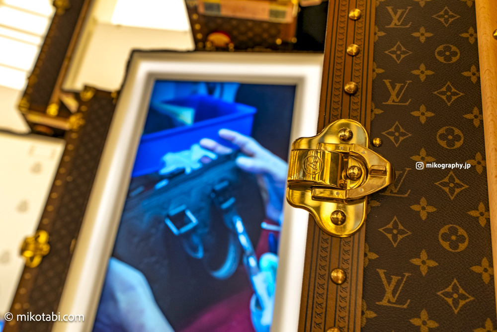 それぞれのトランクの内部には、メゾンのものづくりの精神や哲学を映像で紹介する演出も。
